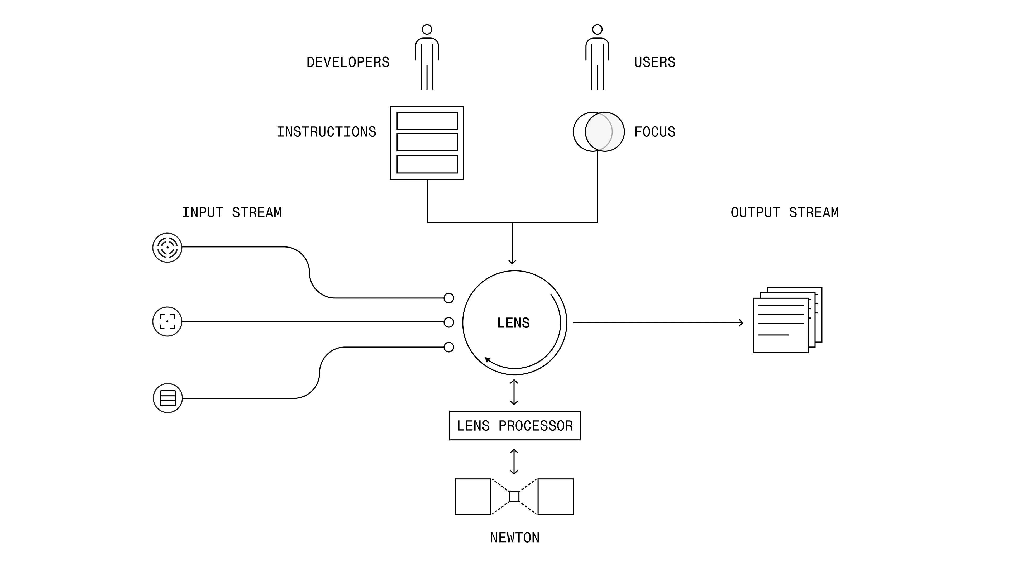 Lenses are applications that run on top of Newton™, providing the model with Instructions on how to transform raw sensor data (Input Stream) into a desired interpretation (Output Stream). Because of the alignment between sensor data and language in the Newton model, these Instructions can be expressed in plain English. Among other things, the Instructions could include the operational context of the lens, specify input parameters (sensor modalities, time window), and structure the format of the output.